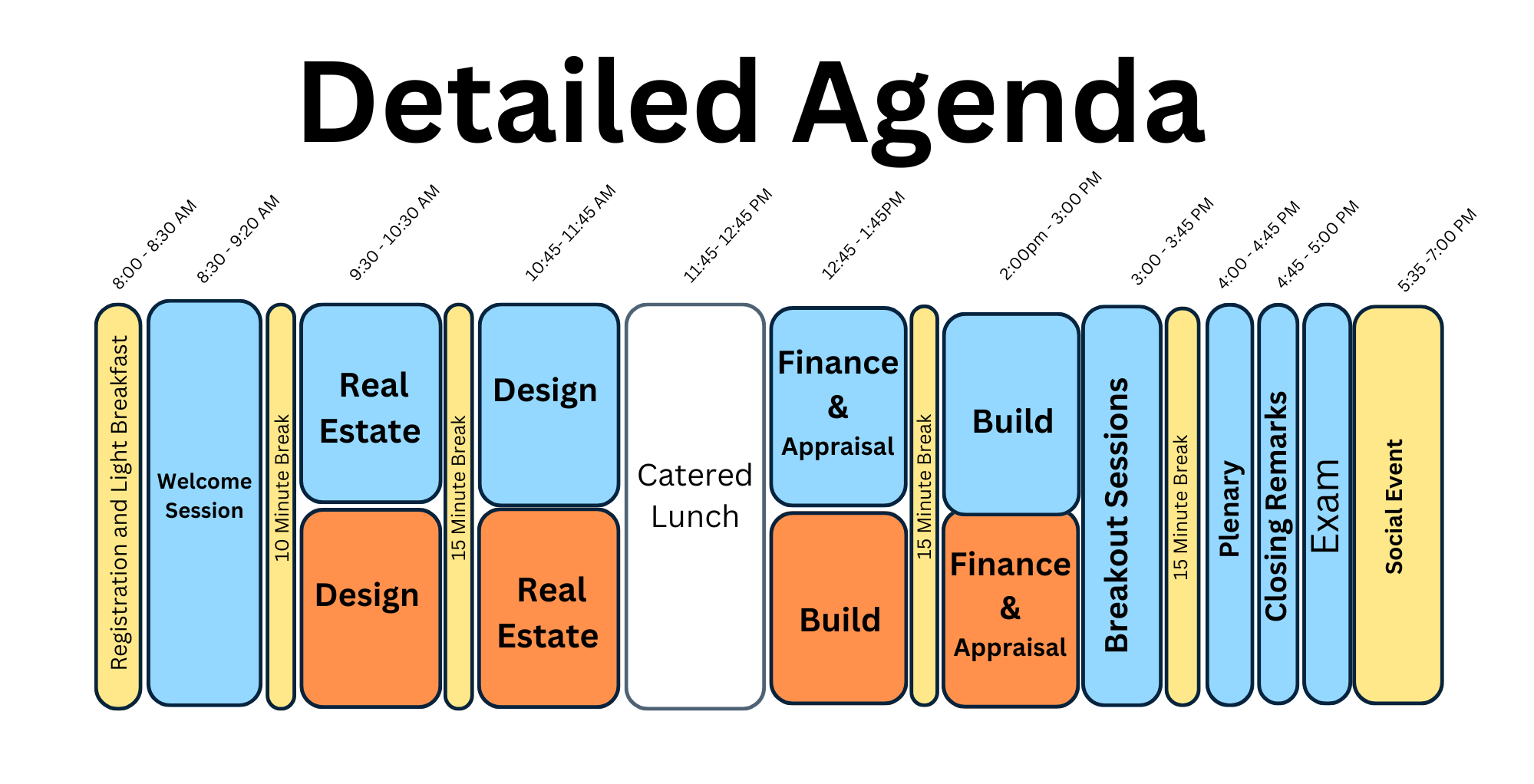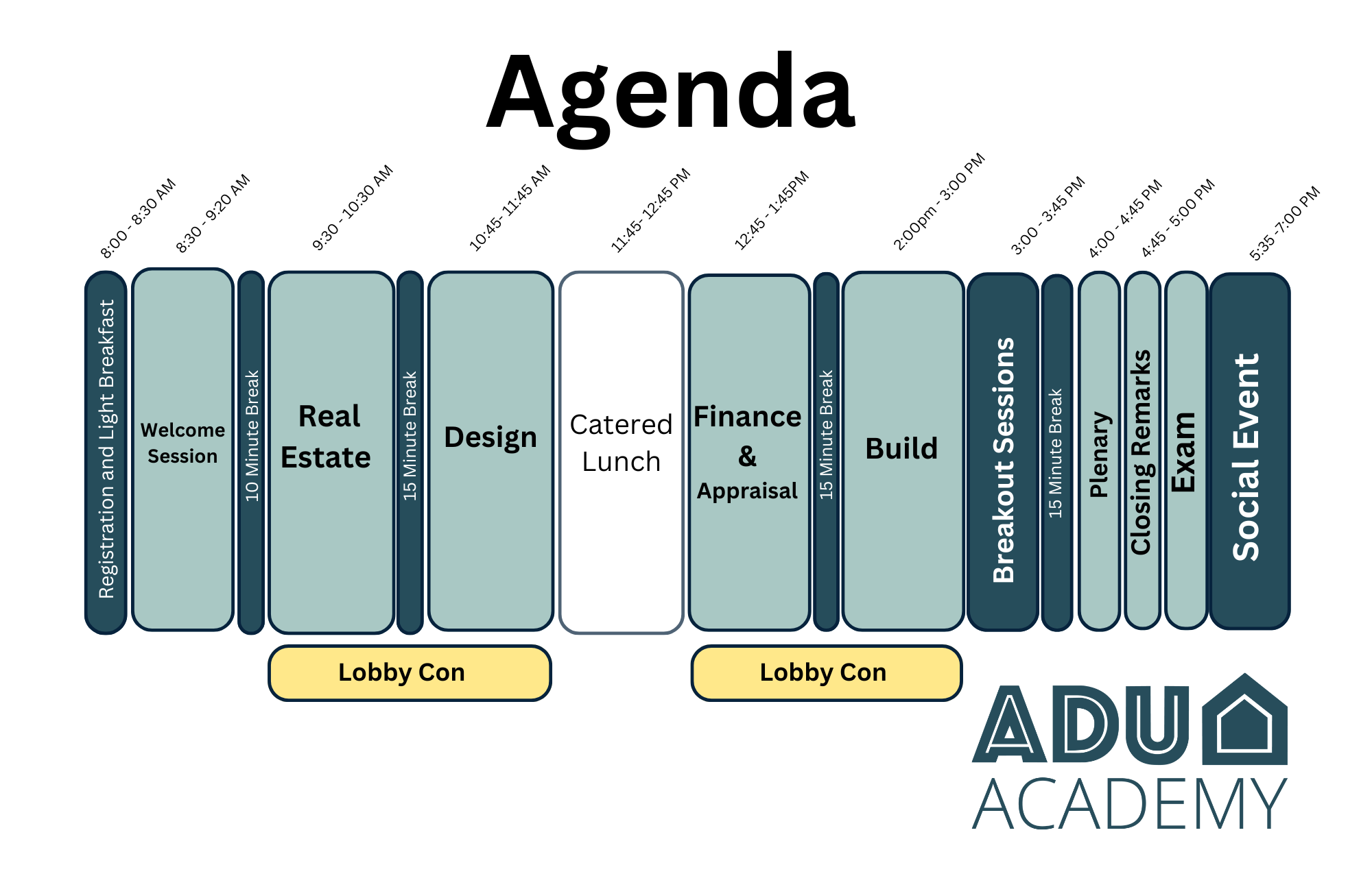 The curriculum is split into four sections, Real Estate, Design, Finance and Appraisal, and Build. Each section will be one hour. The day includes plenty of time to network with fellow attendees that are practicing in the local and national ADU industry.